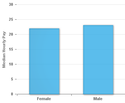 The above chart on the right shows the median hourly pay for women is £21.98 and for men is £23.02, with the difference being £1.03.