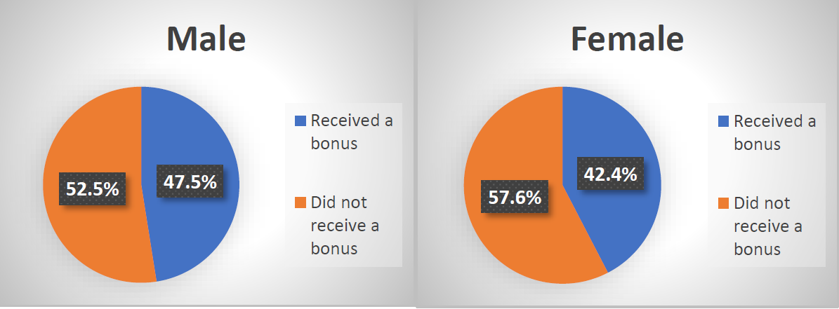 The above charts show that 47.5% of the total male employees received a bonus and 42.4% of the total female employees received a bonus.