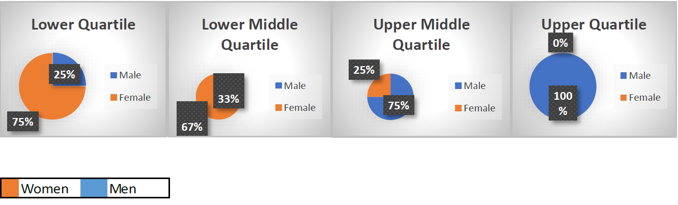 The data above illustrates the gender distribution across four equally sized quartiles of the business. Overall women currently represent 7.5% of Komatsu UK Ltd employees.