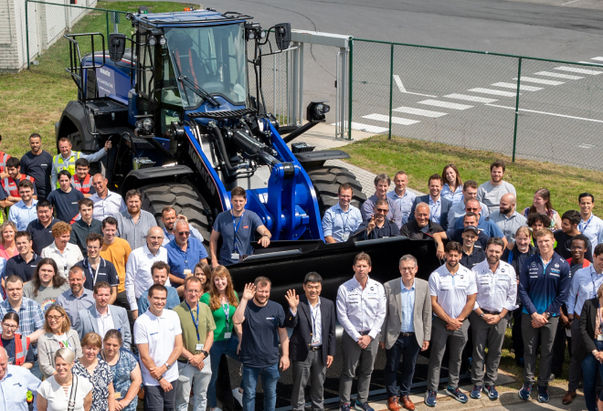 170 Komatsu employees turned out in force to welcome the team warmly to its site and to show them first-hand how Komatsu is creating value together with its partners in Europe. Commemorating the visit, Komatsu Europe International n.v. Managing Director and CEO, Mr Tadashi Maeda, and Chief Financial Officer, Michel Martens, presented James Vowles with a miniature PC1250 crawler excavator.