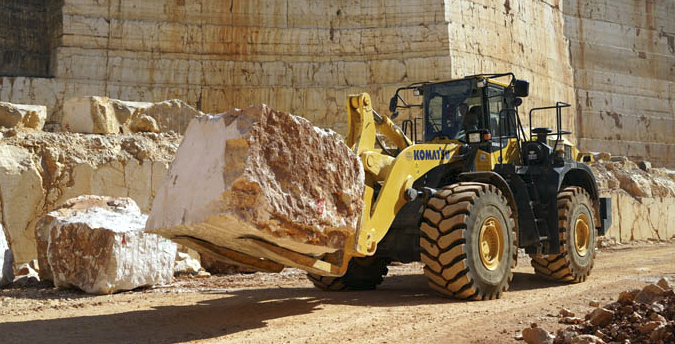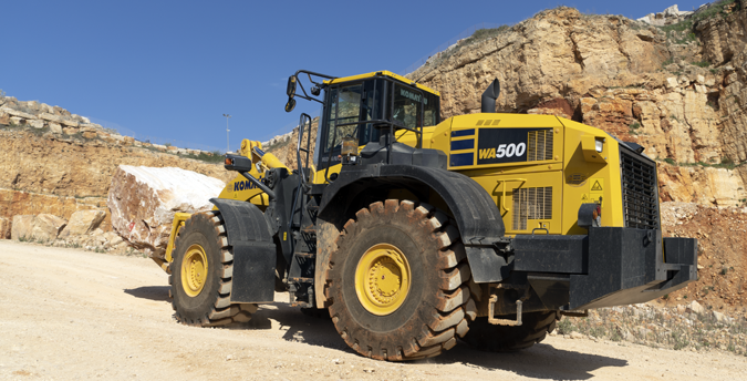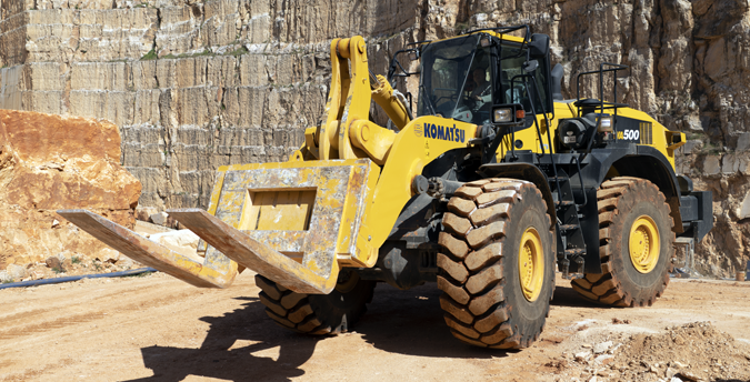 For efficient operations, stone handling requires robust machinery. Komatsu wheel loaders are well-known for their exceptionally strong design, and their long service life even when working under the toughest conditions. The Komatsu WA500-8 in its stone handling specification perfectly adapts to the special requirements of this application. The combination of the modified base machine with a wedge type quick coupler and a specially designed stone fork ensures optimum kinematics for daily work. Special buckets are available on request, and hydraulic modifications to the base machine allow higher loads. In addition, reinforced axles, an axle oil cooling system and additional counterweights provide a package that meets the application requirements.