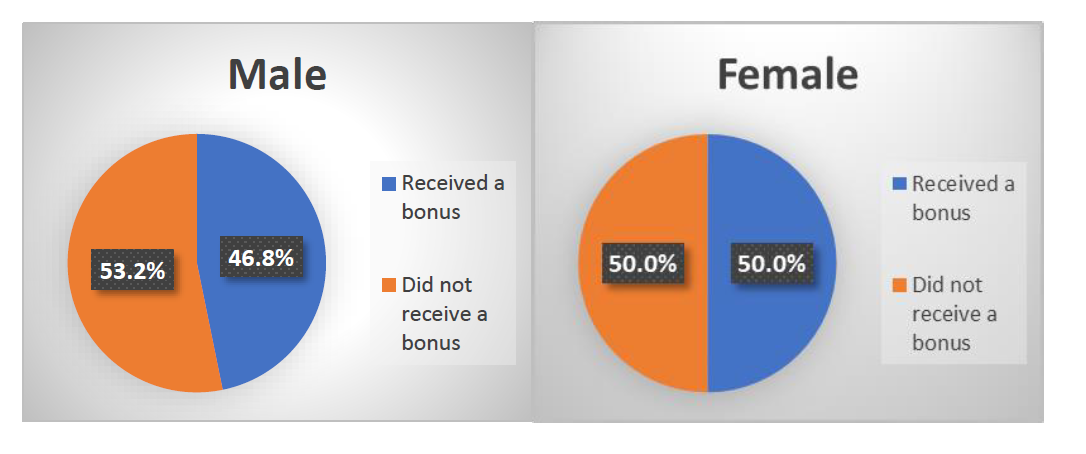 The above charts show that 46.8% of the total male employees received a bonus and 50% of the total female employees received a bonus.