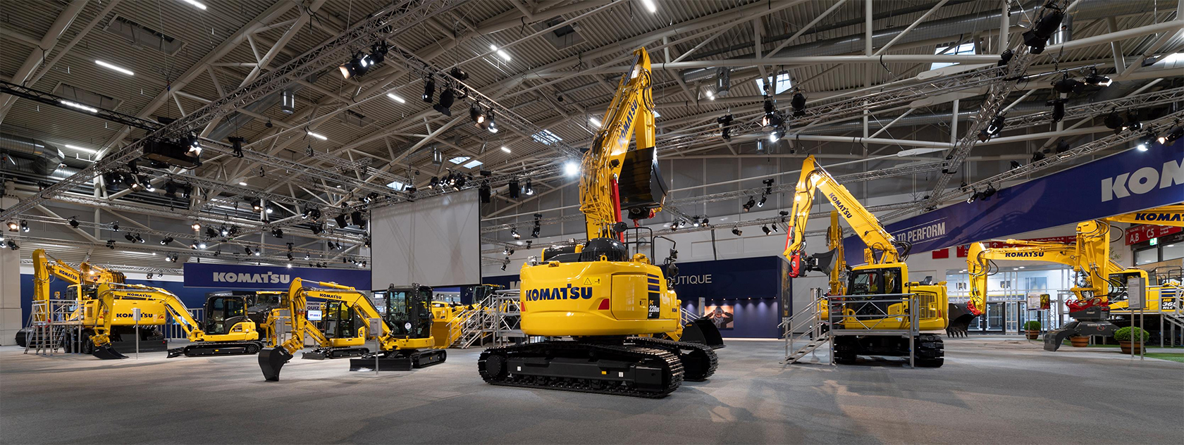Chez Komatsu Europe, les préparatifs pour le prochain bauma commencent dès la clôture de l'édition précédente. Au fil des mois et des années précédant le salon 2019, de nouveaux emplacements ont été loués, plus vastes pour accueillir encore plus de visiteurs. Un nouvel espace a été conçu et aménagé, ouvert et aéré, avec un restaurant au deuxième étage. Les visiteurs ont ainsi pu profiter d'une vue imprenable sur les machines, d’un écran géant, d’une boutique, d'une réception et de salles de réunion au rez-de-chaussée.