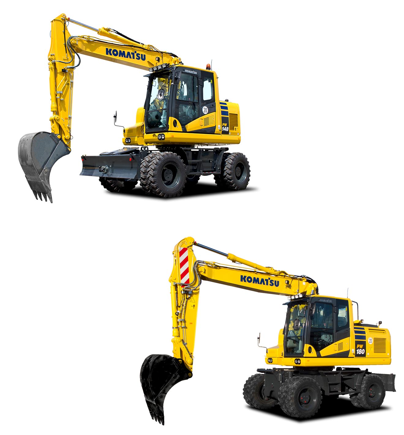 La PW180-11 est plus lourde, avec un poids opérationnel de 17 600 kg à 20 600 kg, et son moteur Komatsu SAA6D107E-3 délivre 123 kW (165 ch) à 2 000 t/min. Le filtre à particules diesel Komatsu (KDPF) retient plus de 90 % des particules diesel et empêche leur propagation dans l’atmosphère.
