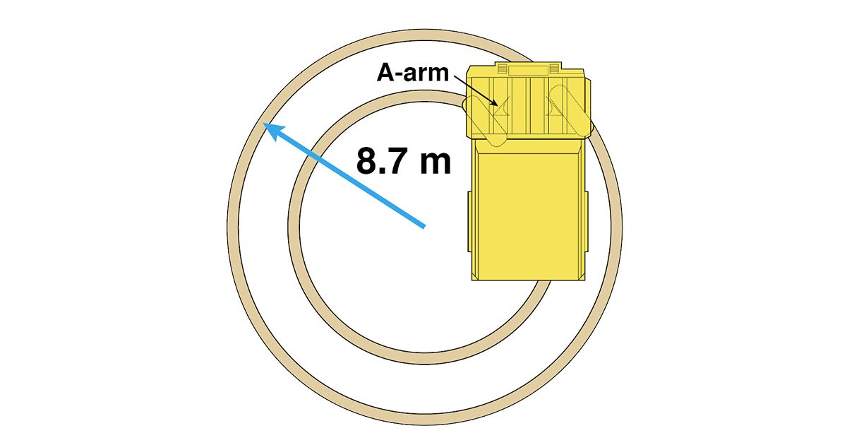 La suspension avant à jambe de force MacPherson possède un berceau en A spécial placé entre chaque roue et le châssis principal. L’espace créé entre les roues avant et le châssis principal augmente l’angle de braquage des roues. Plus l’angle de braquage est grand, plus petit est le rayon de braquage du camion.
