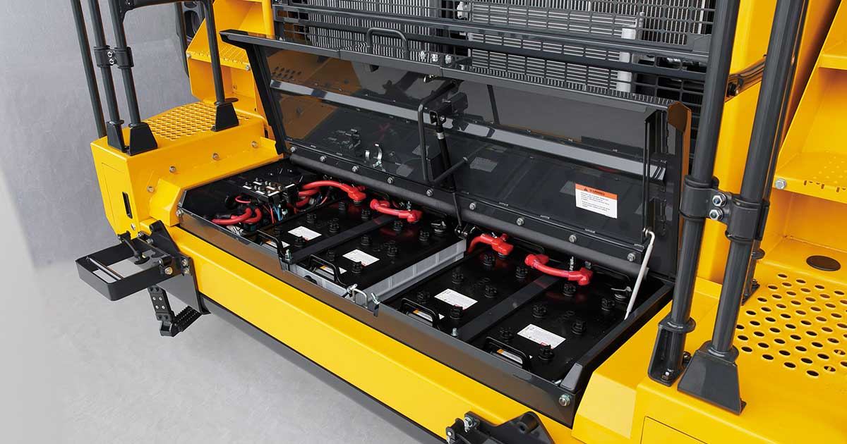 Accès au sol à la batterie et au coupe-batterie : pour plus de facilité et de sécurité lors de la vérification quotidienne et des travaux d’entretien, le coffre à batteries et le coupe-batterie sont tous les deux accessibles depuis le sol.